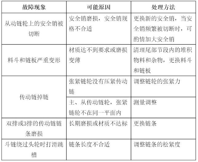 (4)運(yùn)行中,應(yīng)定時查看電動機(jī)、減速機(jī)是否有異常噪聲及斗鏈的運(yùn)行狀況。當(dāng)連接斗鏈鏈板的銷軸損壞或脫落時,應(yīng)立即停車進(jìn)行處理;當(dāng)發(fā)現(xiàn)斗鏈鏈板和銷軸磨損而使斗鏈拉長時,須及時調(diào)整拉緊裝置。